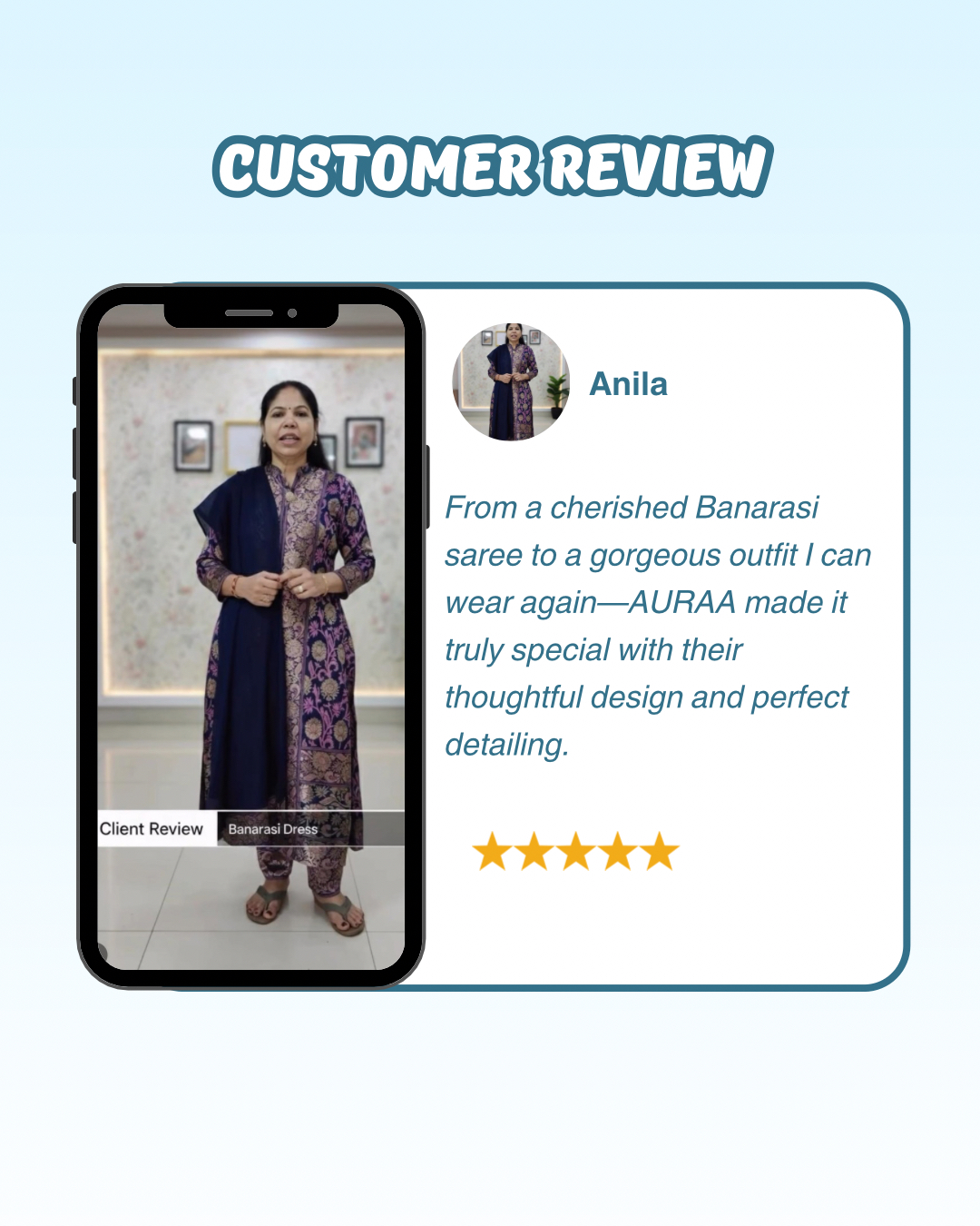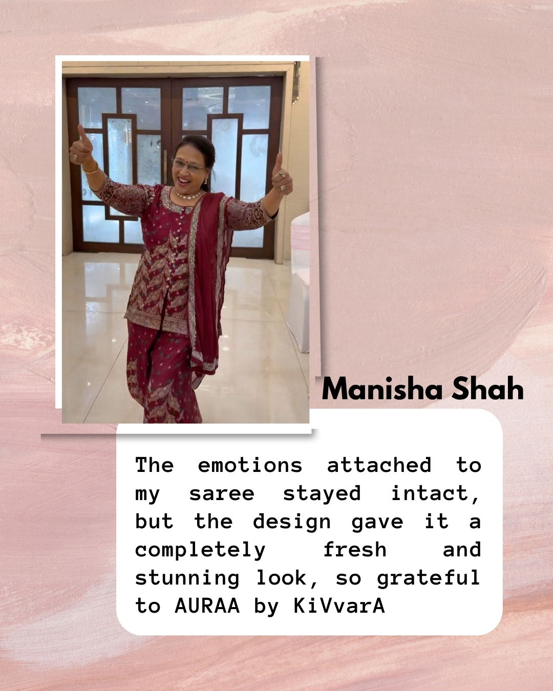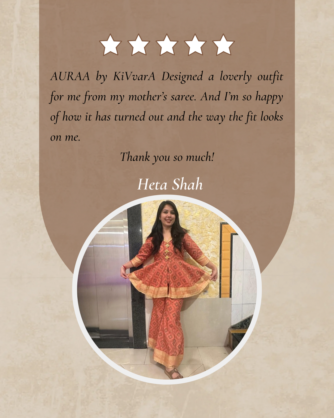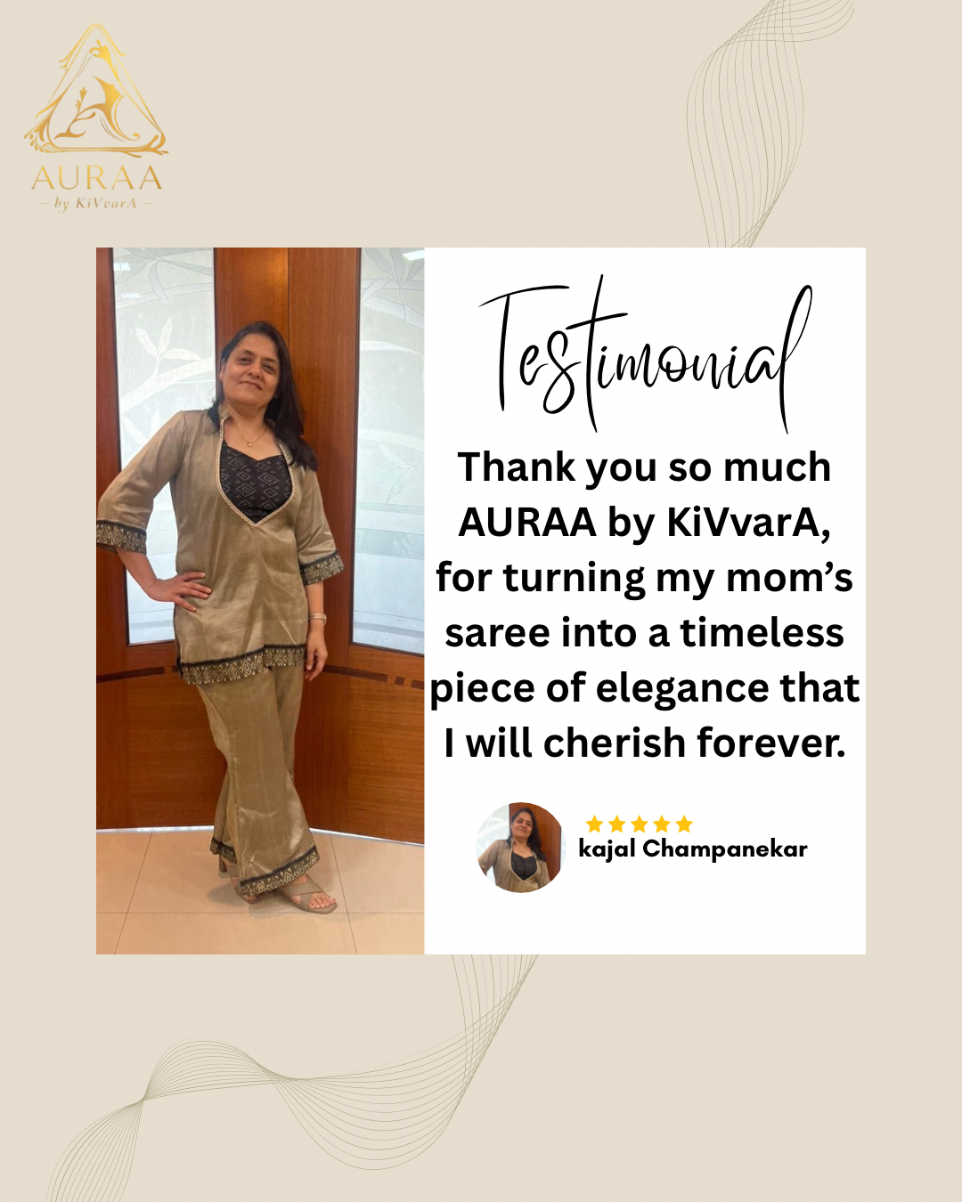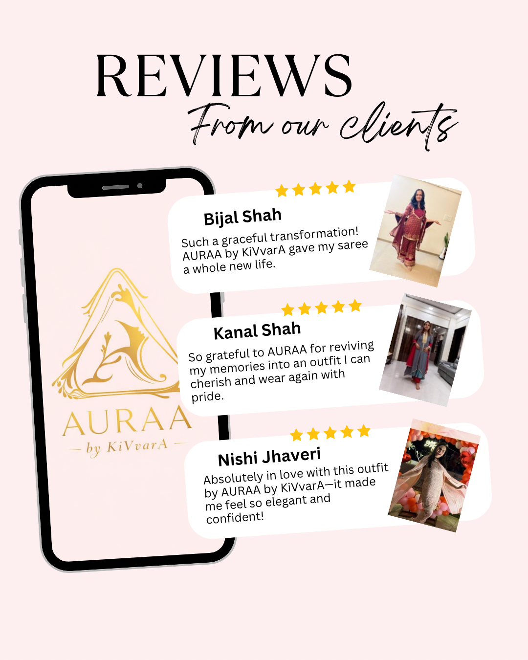 What began as a journey of transforming cherished sarees and fabrics into contemporary silhouettes soon evolved into designing exclusive pieces from scratch. Today, AURAA by KiVvarA stands for elegance, sustainability, and rarity—where every creation is made in limited pieces, ensuring your style remains uniquely yours.