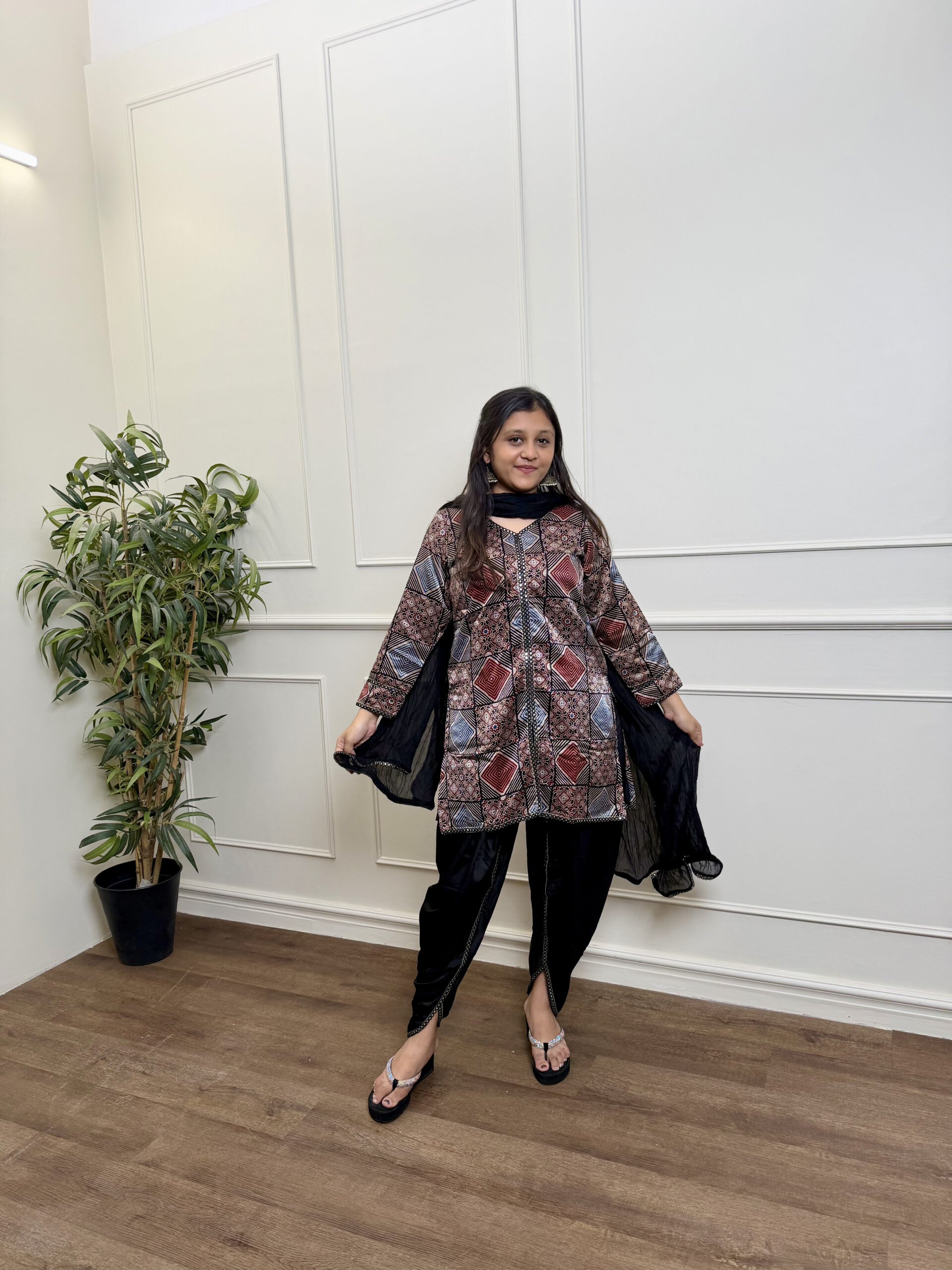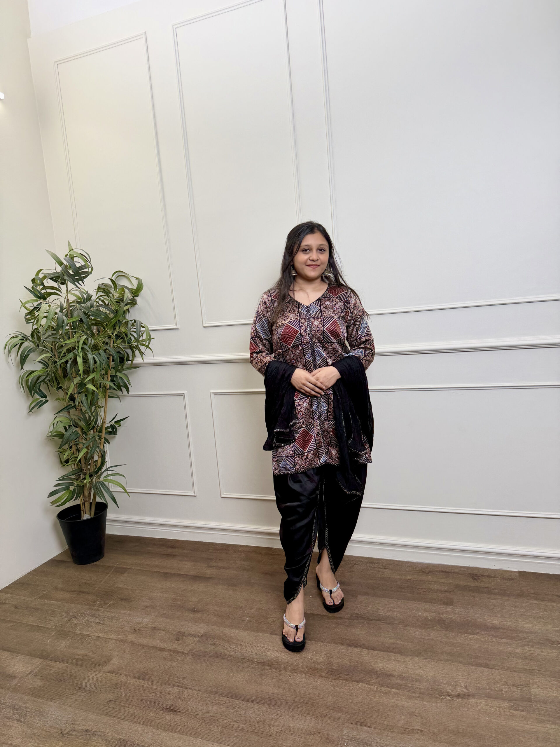 Ajrak Tulip Set blends heritage Ajrakh artistry with modern elegance, featuring a sculpted tulip dhoti and sheer dupatta—perfect for graceful, statement occasions.