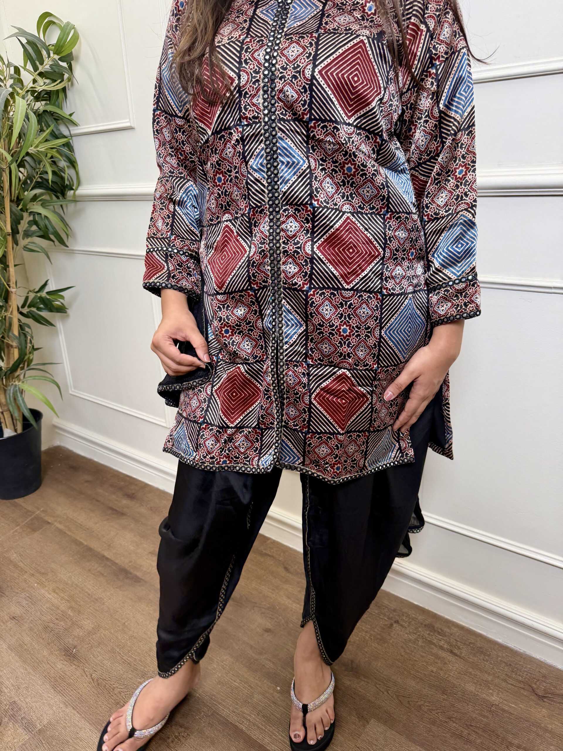 Ajrak Tulip Set is a seamless blend of tradition and contemporary glamour. Crafted from rich Gaji silk, the Ajrakh-printed top showcases timeless artistry with a refined appeal. The ensemble is paired with a sculpted Nysa silk tulip dhoti, creating a unique silhouette that is both stylish and comfortable.