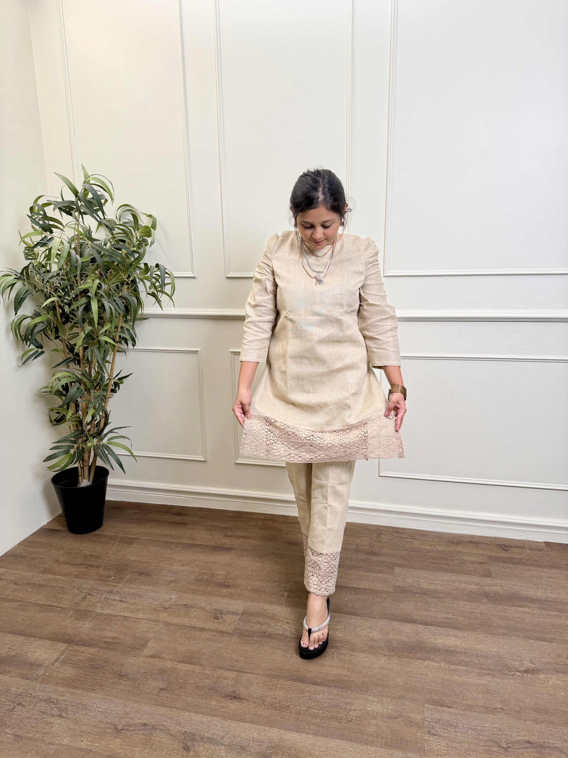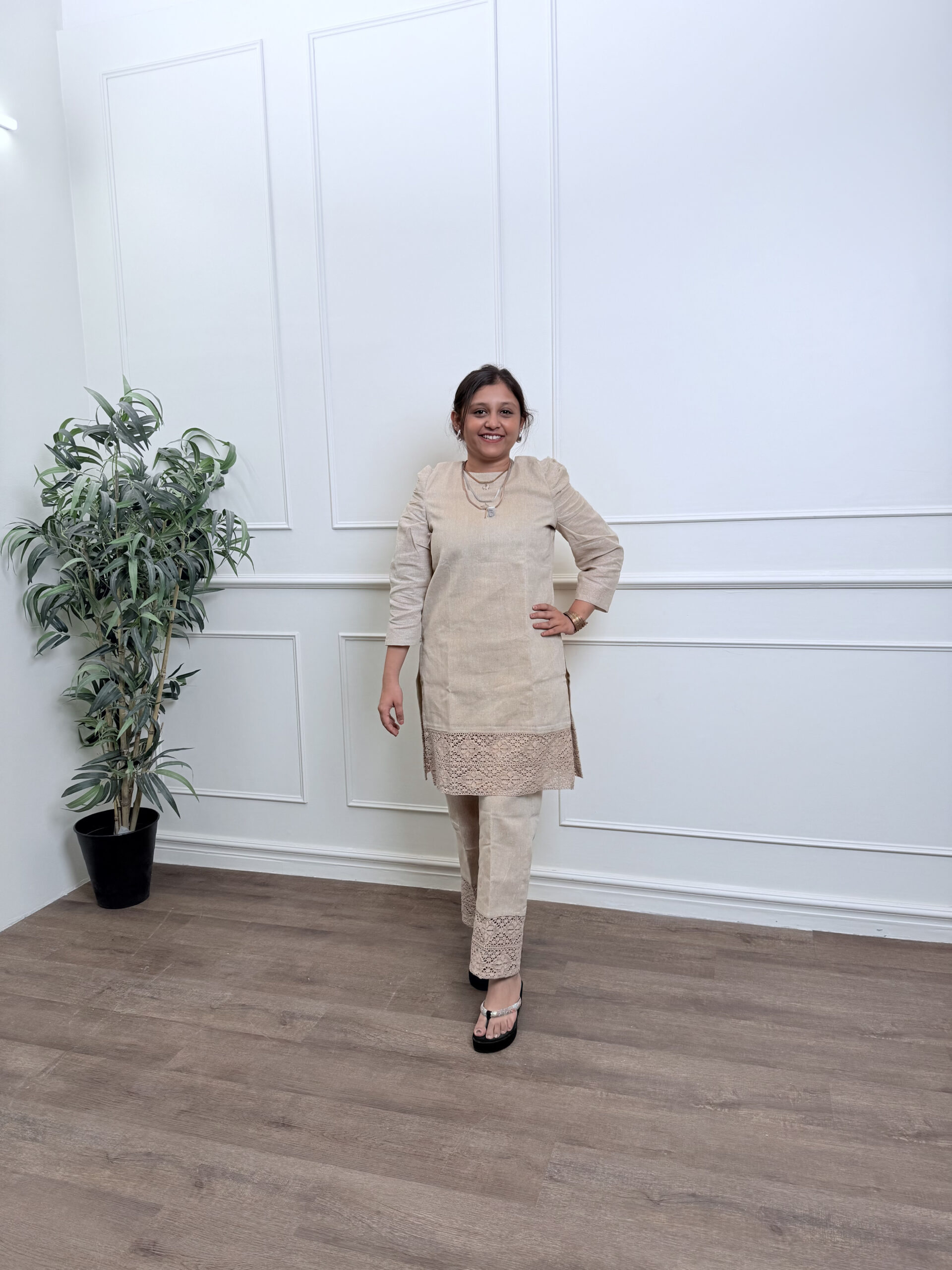 A cotton jute co-ord set featuring a straight kurta and ankle pants, enhanced with delicate crochet details and signature gathered sleeves