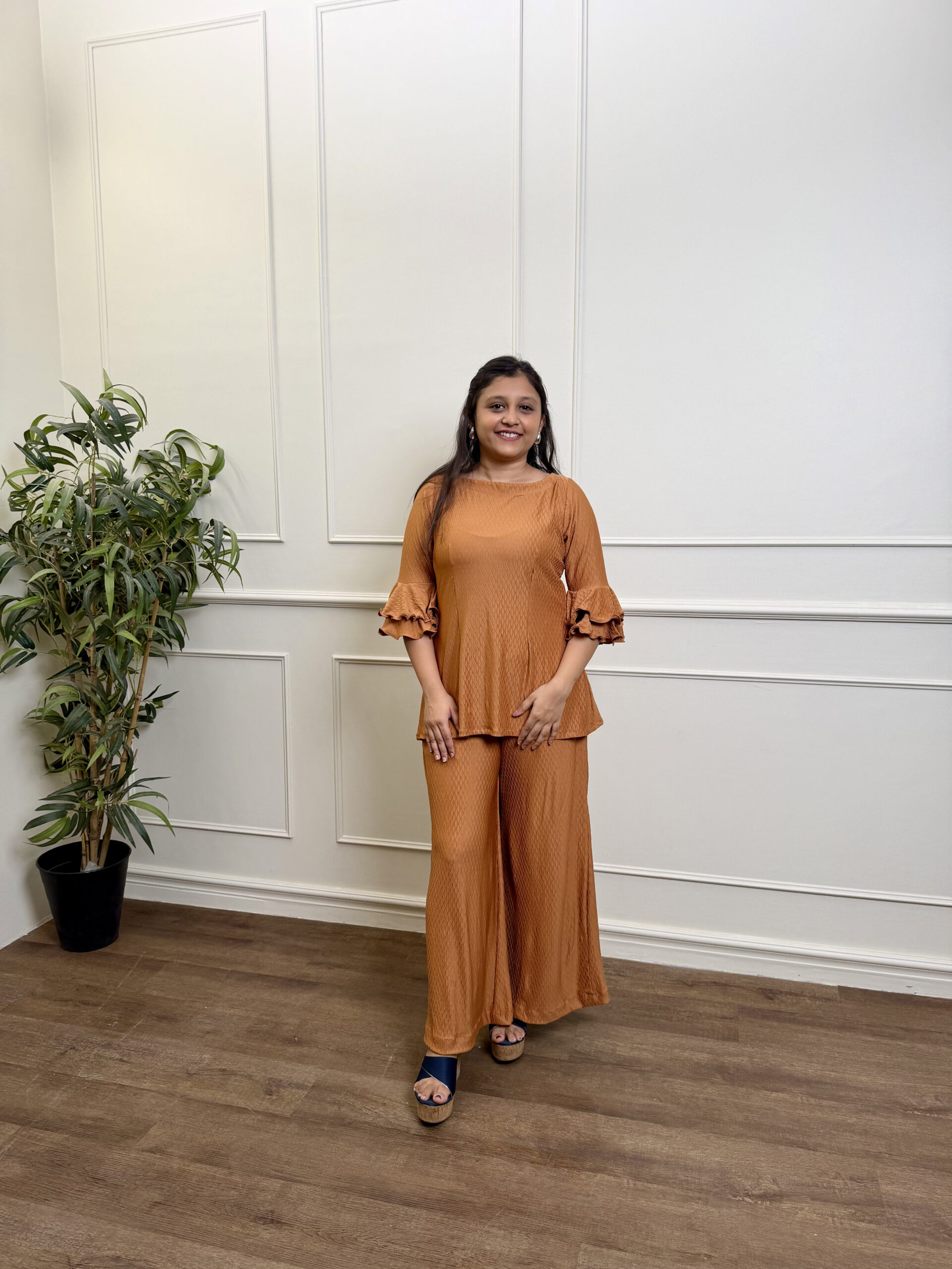 Crafted in imported lycra, this co-ord set redefines comfort with a touch of sophistication. Designed for elevated lounge and airport style, it features dramatic sleeves enhanced with signature peeko detailing that adds a bold and stylish edge.