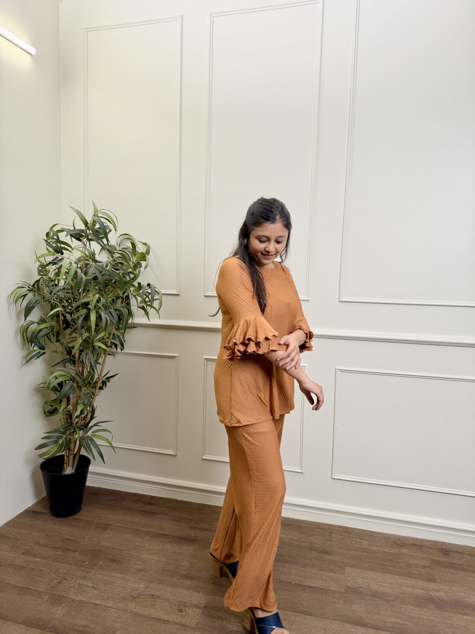 A stylish lycra co-ord set designed for elevated lounge and travel wear, featuring dramatic sleeves and modern detailing.
