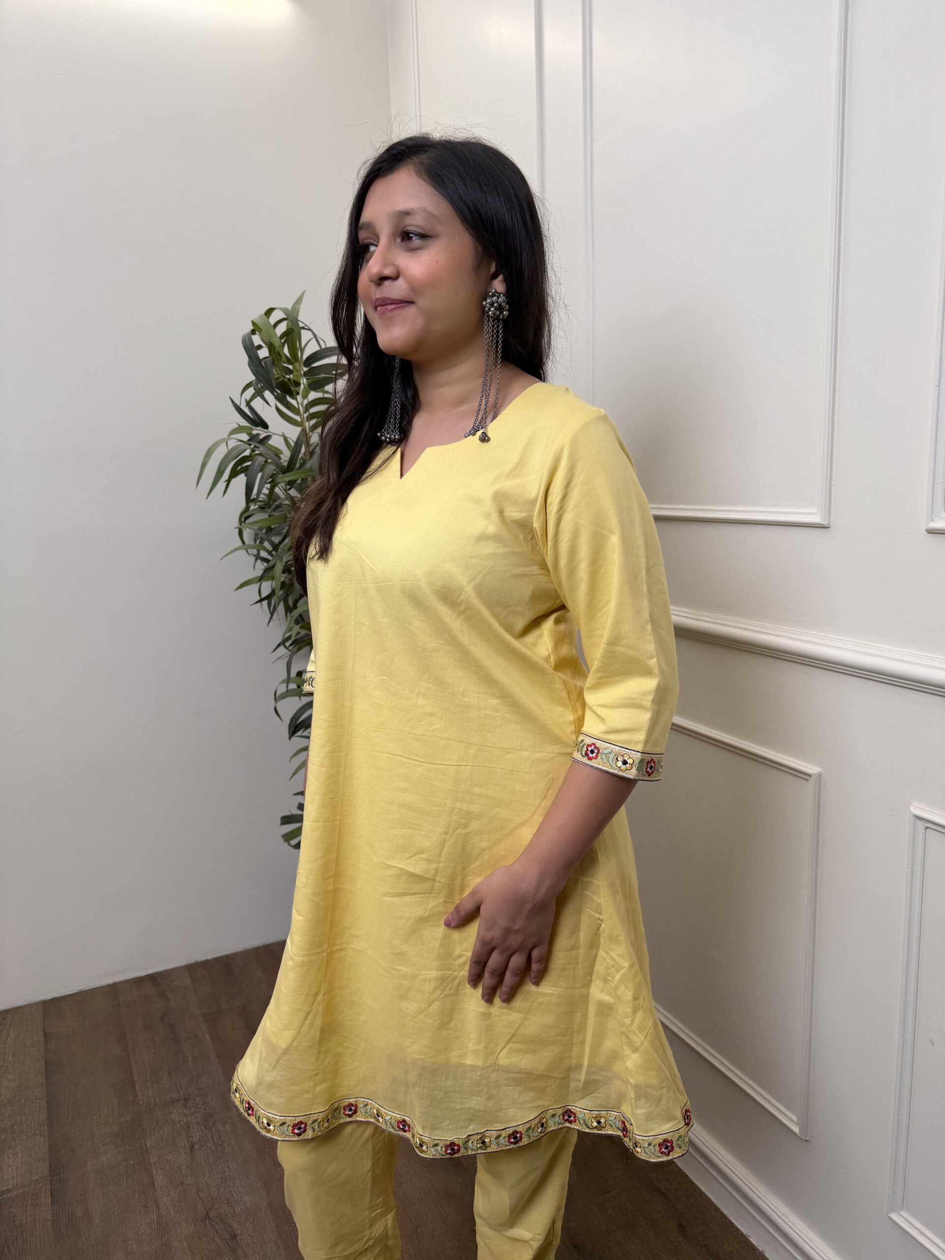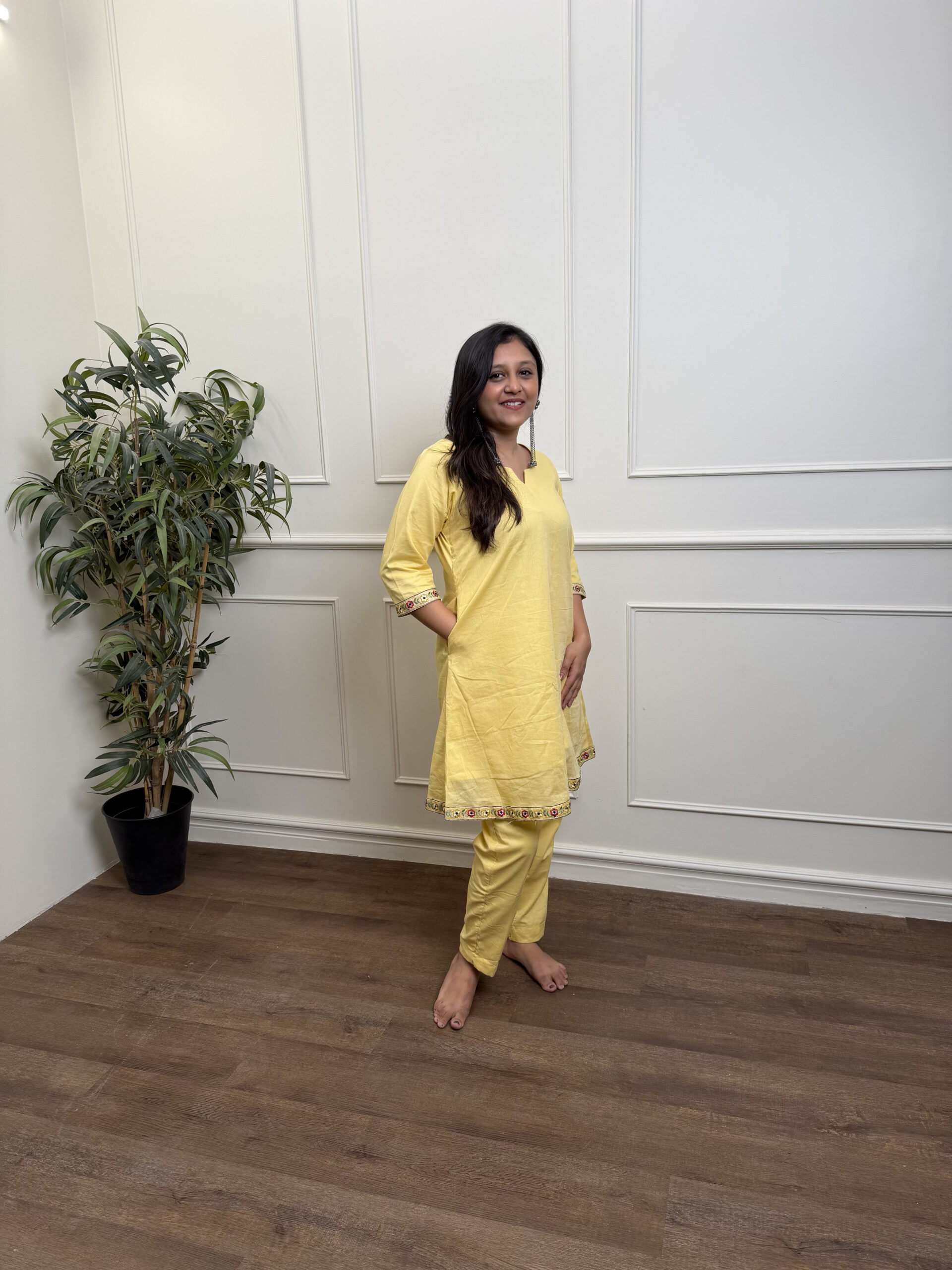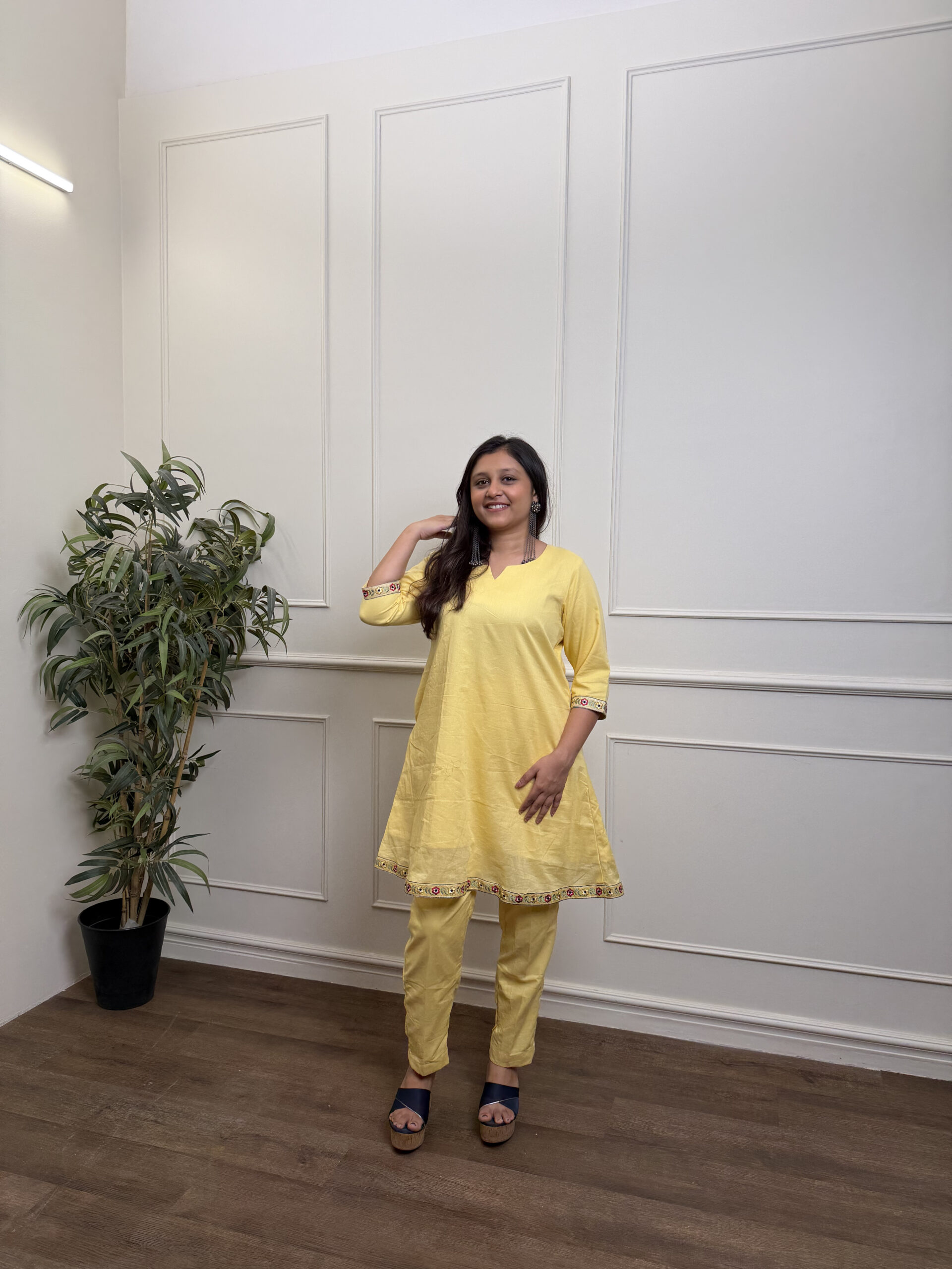 A playful spin on co-ords— flared short kurta meets sharp pencil pants. Finished with borders and our signature pockets.